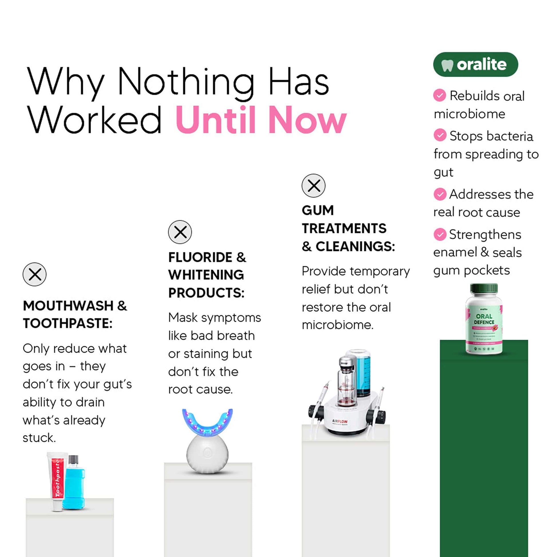 Vous traitiez les symptômes, pas la cause profonde. Le brossage ne peut pas restaurer les bonnes bactéries dont votre bouche a besoin pour se défendre.